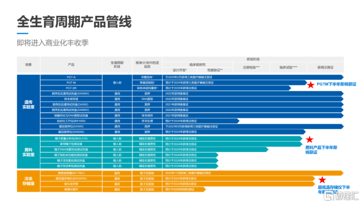 在遗传检测方面,贝康自研的PGT-M试剂盒临床试验已经完成,预计于2024下半年成为中国首个获证能阻断地中海贫血基因的试剂盒;另一款产品PGT-SR试剂盒也是十四五重点研发的国产化产品,能够有效检出以前无法检出的遗传病,预计于2025年成为行业首款取证的产品。男科检测方面,贝康自研的精子分析仪也即将与2024下半年取证,同时还有一款家用精子检测设备也将于今年获得注册证。冷冻存储方面,贝康自研的超低温存储仪是中国第一款专为胚胎、卵子冻存的设备,满足全国每年有1000万新增胚胎需要。