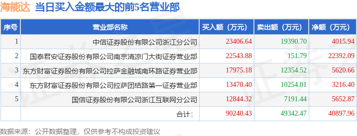 证券小知识:龙虎榜是交易所披露的竞价交易公开信息,现身龙虎榜的个股都是当日最为活跃的个股,是投资者日常重点关注的数据。交易所公布当日买入金额和卖出金额前五名的席位,其中一些席位代表特殊意义,如机构专用席位是指基金专用席位、券商自营专用席位、社保专用席位、券商理财专用席位、保险机构专用席位、保险机构租用席位、QFII专用席位等机构投资者买卖证券的专用通道和席位。深股通专用、沪股通专用为北向资金的交易席位。从龙虎榜数据可以发现和研究机构、游资和散户的资金动向。一些营业部席位经常上榜,市场知名度较高,投资者整理代表散户、游资、量化等不同资金的营业部席位。以下席位信息为市场资料整理,仅供参考。